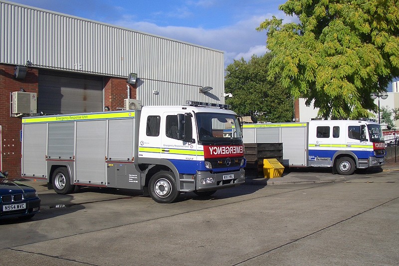 | Details: This view of newly delivered Mercedes-Benz Atego rescue tenders 2600 (nearest) and 2592 at Vauxhall on 24th September 2007 clearly shows the two different cab types fitted. Each base will have one of each variant. | |||||