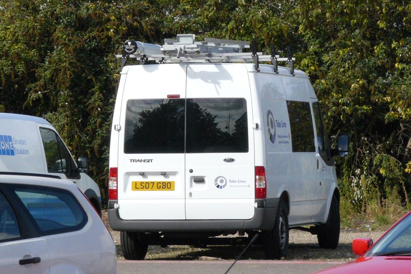 | Details: One of at least four all white Ford Transit crew vans that carry lettering for the Jubilee Line Signal Department, 6340F was found at Stratford East on 26th September 2007. This batch seem to all have the same roof-mounted kit, including a tube and what looks like a ladder or working platform. The lettering on the end of the tube reads Fleetshield Services. | ||||