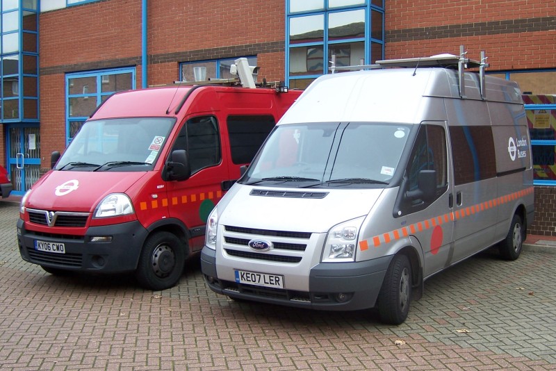 | Details: An addition to the LBSL Technical Services Group fleet during 2007 was Ford Transit van 6321F, seen at their Chingford offices on 27th October 2007. This van is unique in carrying normal LBSL markings on a silver base livery, and it has the roof fittings found on other members of the fleet (such as Movano 6026V alongside). All three liveried vans (Transit 6271F being the third) have recently acquired large coloured discs on their doors, presumably as some sort of identification. Note also the sign on the chevroned rear, reflected in the windows, which warns that the vehicle stops frequently. | |||||