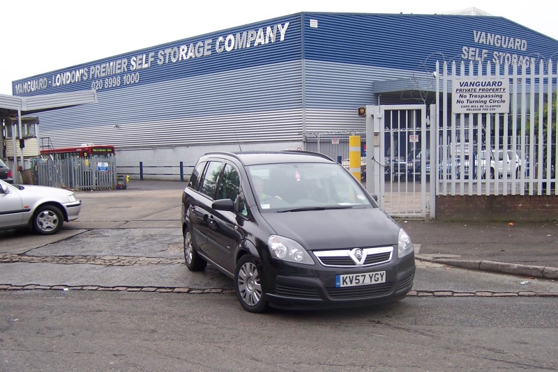 | Details: Metroline acquired a batch of Vauxhall Zafira crew ferry cars in autumn 2007, although their anonymous and varied liveries make identification tricky. Several were based at Perivale East garage from where they run to locations such as Paddington (for route 205). Leaving home on 26th October 2007 is black KV57YGY. This depot is barely visible from the road, the parking area being beyond the large Vanguard building. | ||||
