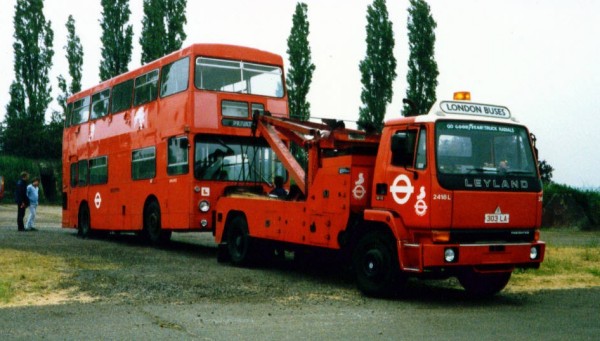 | Details: Leyland Freighter bus recovery truck 2418L was delivered in 1984 and was allocated to the Forest division based in East London. In this picture it is seen towing a trainer DMS bus at an unknown location. Note the trade plates and division stickers. | |||