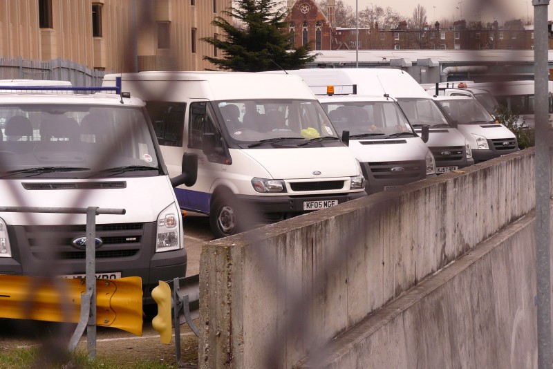 | Details: This view through the fence at the entrance to Lillie Bridge depot on 28th February 2008 has been included as it shows previously unseen Transit minibus 5716F. Dropside 5987F is to the left, while leased BD56YCJ, jumbo van 6205F and dropside 5986F are those to the right. | |||||