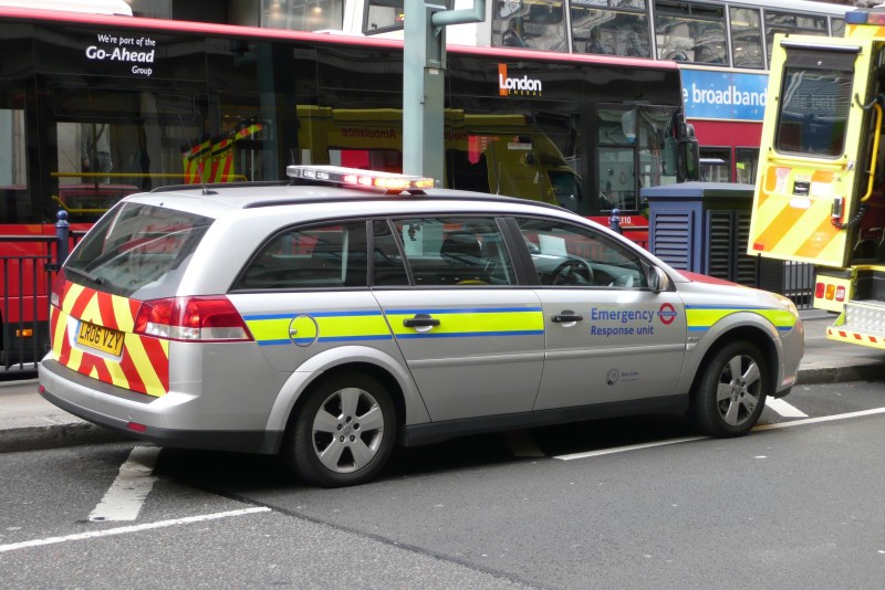 | Details: This Vauxhall Vectra estate car is used by the Emergency Response Unit of Tube Lines and is often seen at one of their bases or attending incidents. On 14th March 2008 it was called out to a 'person under' at Oxford Circus, where it was photographed. Having gained a low-profile light bar in 2007, 2008 saw the side striping changed from red/white 'battenburg' style to this blue-edged yellow, similar to that worn by the new ERU rescue tenders. | |||