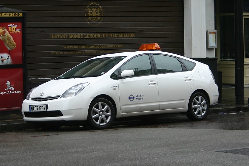 | Details: Newly reported Toyota Prius hybrid car MA07GPV is part of the TfL Streets fleet based at Victoria, near to which it was photographed on 23rd March 2008. The light-bar on this car is narrower than most and appears to be mounted directly on the roof rather than on a rail. | |||