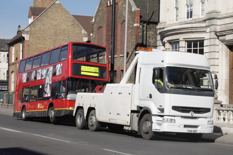 | Details: This picture is clearly more legitimate than the last as it does at least include a London bus. Anonymous Renault tow truck X481ADB was seen with a London Central PVL on tow at Deptford on 5th March 2008. The only 'lettering' is a sticker in the windscreen that reads 'Big Boss', while the bus is notable for displaying reversed blinds for schoolday route 621. | ||