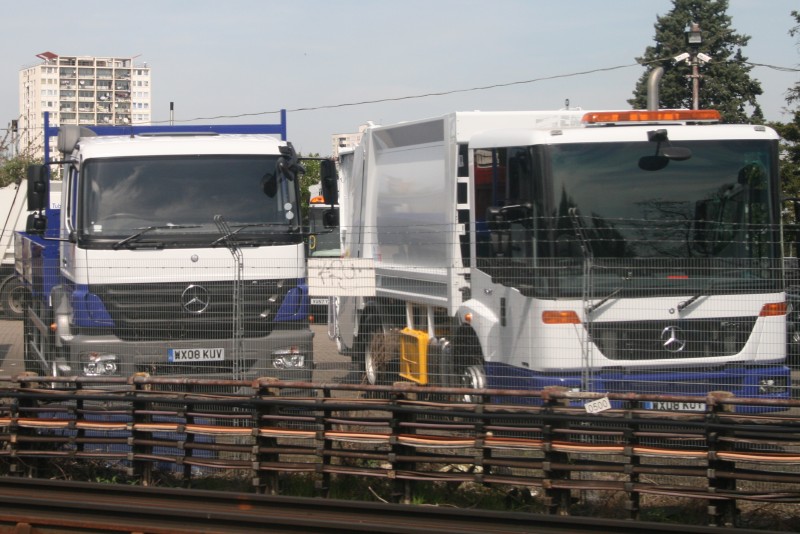 | Details: Several new lorries were delivered in April 2008 including this pair of Mercedes seen in the lorry yard at Acton Works on the 26th. On the left is Axor dropside WX08KUV while on the right is Econic 2-axle refuse truck WX08KUT. Neither had yet had fleetnumbers applied. Note that the livery on the dustcart has the usual amount of blue, in contrast to other recent delivery WX57UMV. | |||||