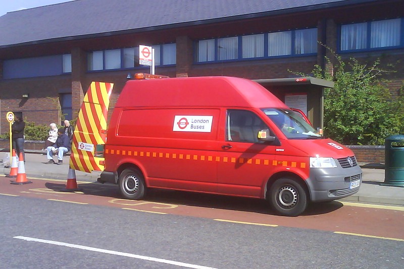 | Details: This view shows high-roof VW Transporter van 5674VW at the bus stand in Thamesmead on 9th April 2008. Points to note are the cut outs in the rear doors to clear the lights, and the rather excessive precautions taken by the operator (cones and a dolly stop). One would have thought the huge chevrons on the rear would be warning enough. | |||