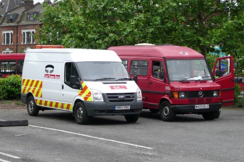 | Details: East Thames Buses received a pair of new long-wheelbase Ford Transit vans in early 2008. In a white livery with company logos and IRU-style side and rear chevrons, they were also fitted with old-type light bars. ETB is owned by London Buses and their service vehicles are sourced through the Tube Lines offices at Acton, hence the KB57 registrations common to many JNP/Metronet vehicles. KB57OSC was found at a deceptively leafy Lewisham Bus Station on 28th May 2008, parked next to crew ferry minibus M429BLO (the latter still displaying its E10 fleetnumber). | ||||