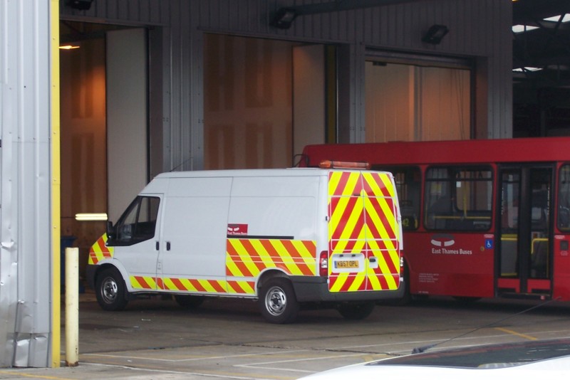 | Details: One of two new Ford Transit vans delivered to East Thames Buses in spring 2008, KB57OPL was tracked down at the Mandela Way operating centre on 30th May 2008. Notable is the prominent side and rear striping, almost identical to that applied to the recent LBSL IRU vans. | ||||