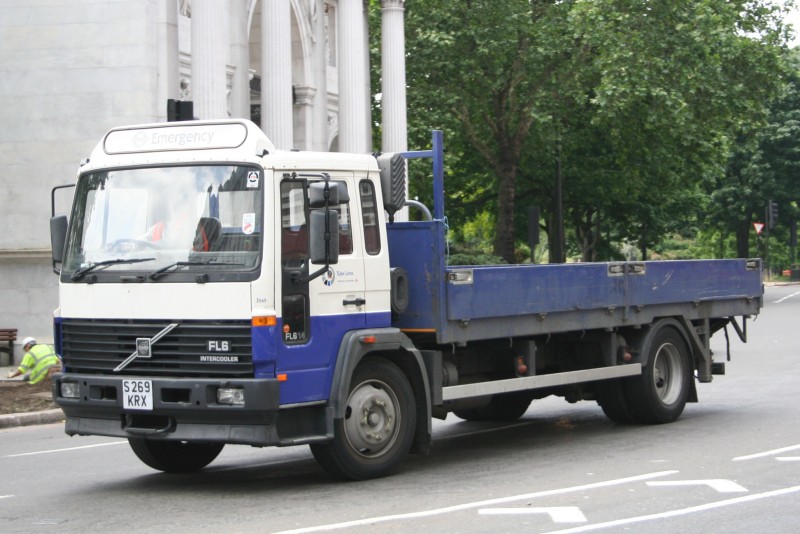 | Details: Here is a first proper look at a former ERU Volvo demountable in general use. 2569V was caught as it rounded Marble Arch on 10th June 2008. The most noticeable change is the repaint of the front panel from red (with white lettering) to plain white. Other changes are the removal of the red and white side striping and addition of Tube Lines logos. The Emergency lettering on the illuminated headboard has been painted out but is still visible. Note that the wheel cut-out on the dropside body lines up with the wheels, something that did not happen with the Mercedes and Iveco lorries. It is thought that the bodies were modified when the Volvos were delivered, although they were very rarely used together until the recent redeployment. | |||