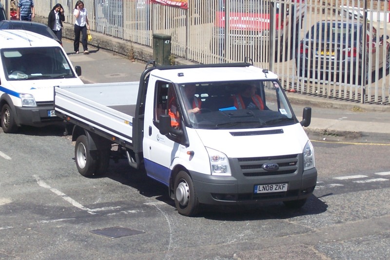 | Details: When we first saw this photo we assumed it was of a Transit tipper, clues being the unpainted bodywork (most dropsides have blue bodies), the high mud-guards and the headboard. However, looking at the Ford Transit specification sheet, it appears that this is a factory-fitted dropside body after all. These have all the features above, plus the step below the front. 6386F was probably brand new (note the lack of dirt in the back) when seen on Cody Road, West Ham on 3rd July 2008. This location is close to the new West Ham bus garage but there is also a Grant Rail depot nearby, which could explain the presence of a Tube Lines vehicle. | |||