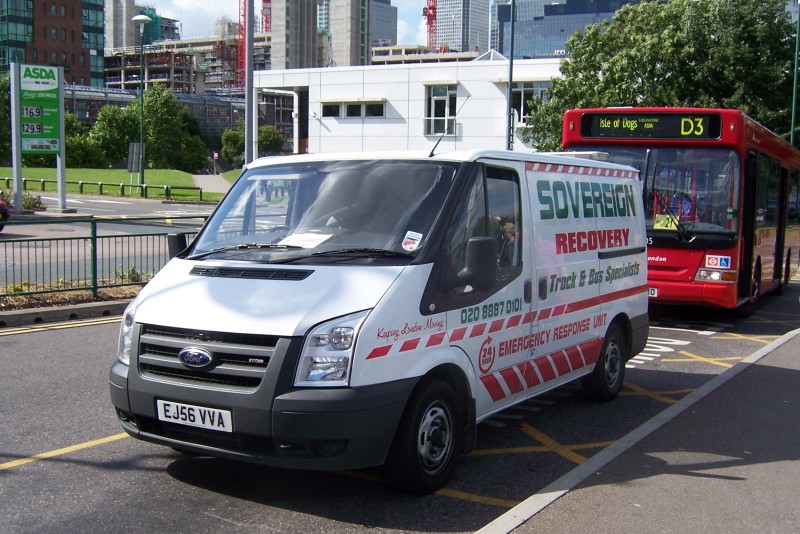 | Details: While their massive Volvo breakdown lorries attract more attention, Sovereign Recovery also runs a fleet of standard vans for roadside engineering assistance. Typical of these is Ford Transit EJ56VVA, found at Crossharbour Bus Station on 25th June 2008. Note that a fleetnumber is painted close to the fuel filler point but it is not readable in the original photo. | |||