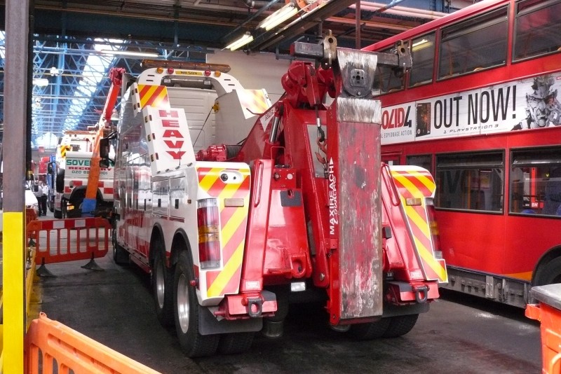 | Details: The third Sovereign Recovery vehicle at the Bow Garage open day on 28th June 2008 was Volvo N8SOV, and this view shows the business end. The angled rear stabilisers are in the raised position. Note the scuffing on the bottom of the raised spectacle hoist arm, caused by contact with the road surface whilst in use. The lorry is almost as tall as the double deck Trident bus on the pit road alongside. | ||||