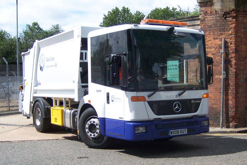 | Details: Tube Lines have reversed their recent decision on fleet numbers and will in future be using cast metal numbers. Here we see number 1824 leaving Acton.... Oh, who am I kidding! This photograph shows Mercedes Benz Econic 1824 dustcart WX08KUT (known internally as 'KUT') leaving Acton works on 26th June 2008. The fleet now has four such vehicles, this two axle variant seemingly having replaced similar but prematurely withdrawn 2576 dating from 2000. The other trio are all three axled. | ||||