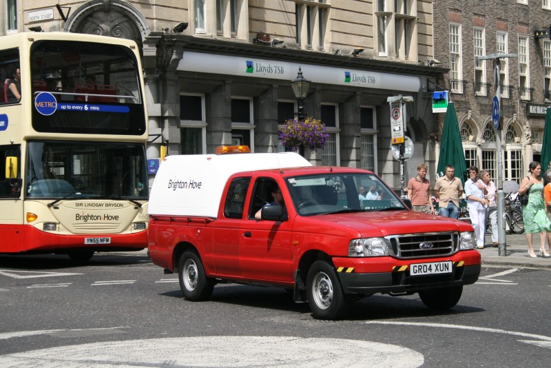 | Details: My recent comments on Ford Rangers prompted Damon to send in photos of all three such vehicles operated by Brighton and Hove. As part of the very occasional coverage of non-London service vehicles, I am publishing this view of GR04XUN, taken on 30th July 2008 as it was being pursued by a Scania Omni-whatsit (Dekka?). The vehicle has a light-bar, hard-top and a small crew compartment without doors. Apart from the height of the hard-top, it would appear to be very similar to 'weedy' 5953F. | ||