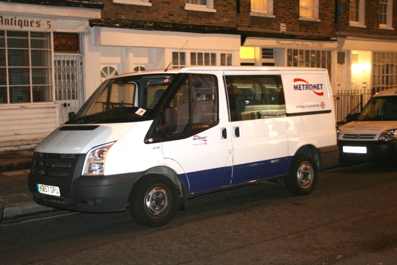 | Details: The fact that most of the 5880F to 5885F batch of Metronet Ford Transit crew vans can be seen around Griffith House at night was mentioned recently. They have now been joined by a larger batch of similar vehicles, with fleetnumbers between 6412F and 6423F. On the night of 19th August 2008, John snapped diesel-engined 6418F on Harcourt Street. | ||||