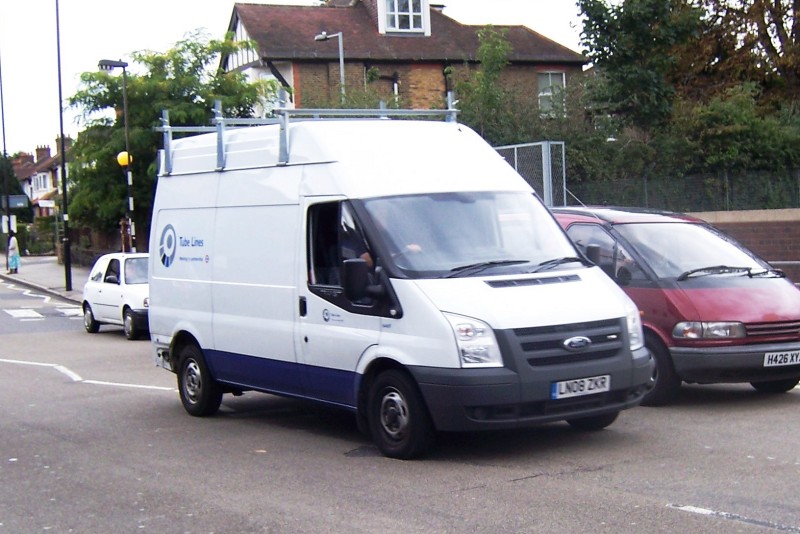 | Details: Fairly new but seemingly already damaged, 6445F is a slightly unusual Ford Transit in being high-roof but medium wheelbase. That perhaps explains why it has three roof bars instead of the more normal four. The van is liveried for Tube Lines as it is based at the Piccadilly line depot at Northfields and it was seen close to home at Acton Town station on 8th September 2008. | |||