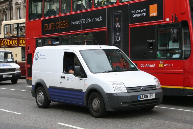 | Details: This Transit Connect was seen on Parliament Street on 11th September 2008, suggesting it is one of the internal mail vans. Numbered 6511F, it has a slightly different appearance compared to other recent Connects, with extra lamps in the lower bumper. This may be part of the LX specification, as indicated by the badge on the side. In the background is a London General WVL and one of the new Big Bus Co Visionaires. | |||