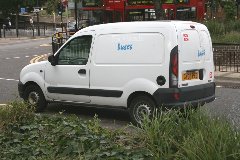 | Details: My comments about the lettering on this van the last time I published a photo of it (in May 2008) proved to be a bit off the mark. It does in fact wear full Docklands Buses lettering, but the practicalities of this are evidently lacking! It was found near Stratford Bus Station on 19th August 2008. | ||||