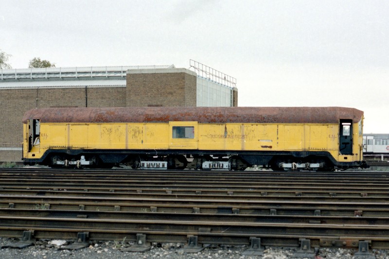 | Details: This curious looking machine has no less than eight axles on four bogies. It was one of 18 sleet locomotives built in 1939 and 1940, each being formed by joining two 1903-vintage electric locos together, back-to-back. The resulting locos were numbered ESL100 to ESL117 and were used to clear ice from the rails. The fitting of de-icing equipment to many passengers cars rendered them surplus in the 1970s and 1980s and most were scrapped, just ESL107 surviving in the LT Museum collection. ESL117 was looking a bit worse for wear when seen at the Ruislip Depot open day on 28th October 1990. | |||