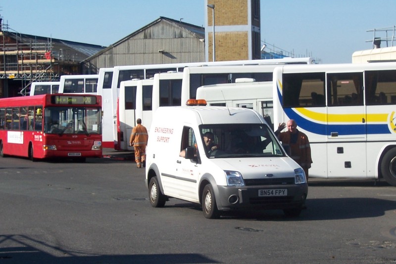 | Details: Complete with a jolly crew, this is Travel London engineering support van 8910, seen at Fulwell Garage on 11th October 2008. The Ford Transit Connect had been in the fleet since at least December 2007 (when the service vehicles were allocated numbers) but this was the first reported sighting. Unsurprisingly, the fleetnumber did not appear to be carried. The buses in the background include some Dennis Tridents in Kingston University livery, and one of the former Travel West Midlands Volvo B10Ls used as trainers. | ||||