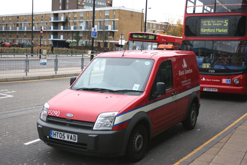 | Details: This vehicle has been illustrated before (and was on the front cover of SUP24C) but it has been included again to show the return of the fleetnumbers. Most of the former Stagecoach service vehicle fleet lost their five-digit fleetnumbers at the same time as their Stagecoach logos. The fact that the numbering system remains in use was evidenced by the delivery in 2008 of new vehicles carrying numbers in the 960xx range. Upton Park's Ford Transit Connect van HT05VAD was numberless in 2007 but had had one reapplied when it was photographed at Canning Town Bus Station on 13th November 2008. This photo also shows the fading of the reflective stripes, typical of vehicles left outdoors. | |||