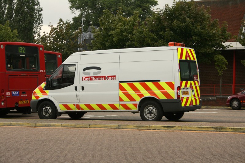 | Details: We didn't have enough vinyls to finish this one! East Thames Buses took delivery of a pair of Ford Transit vans in spring 2008 and they had this curious chevron pattern applied to the sides as well as the more normal rear. The layout is in fact identical to that carried by the London Buses Incident Response Units (such as 6357M) but looks even odder on a white background. Photographed at Eltham Bus Station on 20th August 2008. | ||||