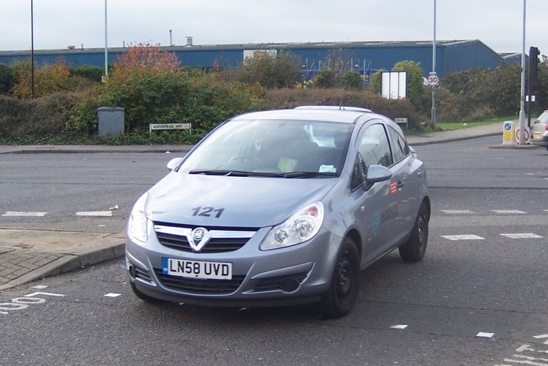 | Details: In recent years Arriva London has made use of a large fleet of Vauxhall Combo vans for crew ferry duties. When new route 135 started in May 2008, it was supported by a new batch of silver 2-door Vauxhall Corsa cars, and later in the year more of the same were delivered to other garages to make a start on replacing the vans. One of the first bases to be dealt with was Lea Valley, which took cars numbered 121 to 135. 121 was caught as it turned towards the garage off Watermead Way on 14th November 2008. | |||