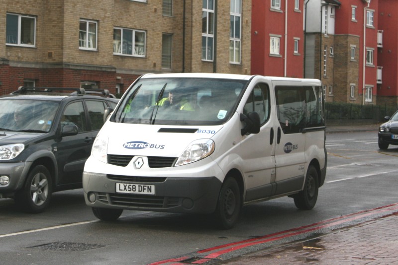 | Details: Metrobus renewed a large part of its crew ferry fleet in October 2008, when 14 Renault Trafic minibuses replaced a similar number of 5-year old Ford Transits. The new minibuses were numbered 8028 to 8041 and all but the last three were allocated to Orpington. 8030 (LX58DFN) was seen passing Bromley North Station on a damp 8th November 2008. | |||