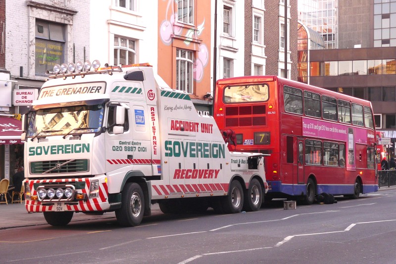 | Details: Another Sovereign Recovery Volvo, this time P8SOV (named The Grenadier) on Edgware Road on 3rd January 2009. Note the engineer poking around under the rear wheel of the ailing Metroline Scania. This vehicle is broadly similar to N11SOV with detail differences in the livery and front-end fittings. Of note is that the registration P8SOV was earlier carried by a rather different Volvo recovery truck named Churchill (that Damon photographed in August 2006). With a small pool of 'select' registrations, such transfers are likely to take place as the fleet is renewed. Given that the vehicles are often essentially the same, I will not attempt to differentiate them on the database. | |||
