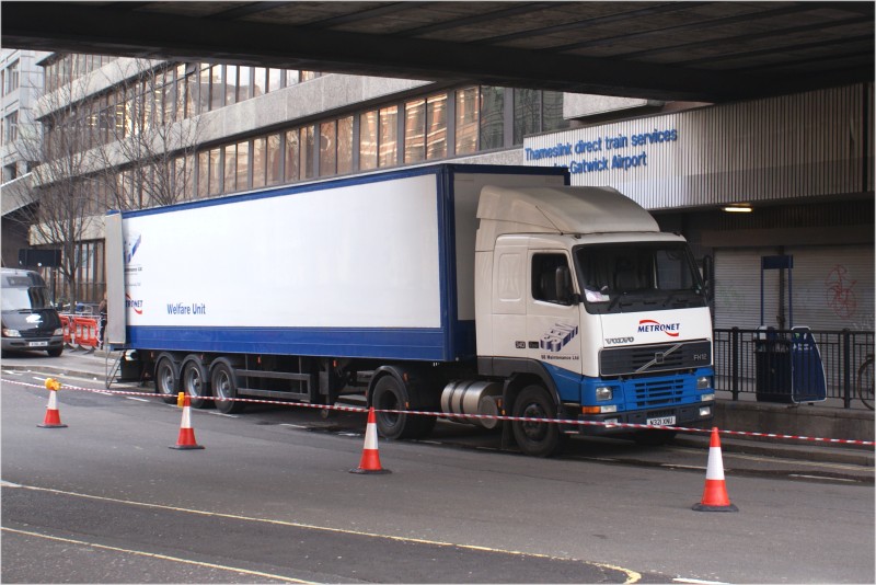 | Details: This vehicle was found by Ray at Blackfriars Station on 24th January 2009. Although wearing a sort-of white/blue livery and Metronet logos, it is not what we would call a real service vehicle. Owned by SEM (SE Maintenance Ltd), the Volvo FH12 tractor unit and box trailer are used as a mobile staff welfare facility in connection with major works. We don't know exactly what is inside but there is a set of steps set up at the rear doors. The trailer (or one very like it) was stationed at Hornchurch Station for some time recently, during which a TV aerial was visible fitted to the rear. | ||