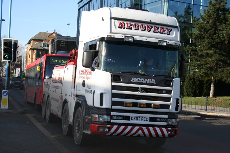 | Details: C Spearing is one of the 'lesser spotted' bus recovery firms that work in London (last seen in 2006), and should not be confused with the C&S group! One of their trucks was seen on 21st January 2009 coming down Chiswick High Road at Gunnersbury with a Transdev Enviro 200 on tow. These buses are based at Hounslow Heath for route 285 so it was presumably being taken somewhere for repairs. The truck is a four axle Scania 164G 580 with Boniface gear and a modest array of front lights. It does however have one of the trucker's favourites in the form of a chrome lady on the radiator grille. | ||