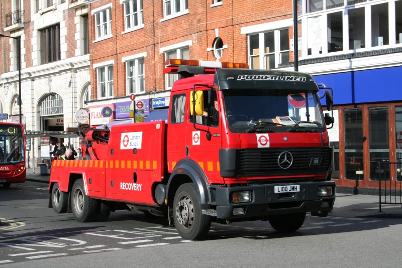 | Details: The contract to provide a London Buses-liveried recovery truck on standby in central London was recently awarded to Sovereign Recovery. This has meant the departure of Mercedes-Benz SK series L100JMH, the operator of which we never determined. A final view of this truck is provided in this photo taken at Victoria Bus Station on 22nd October 2008. | ||||