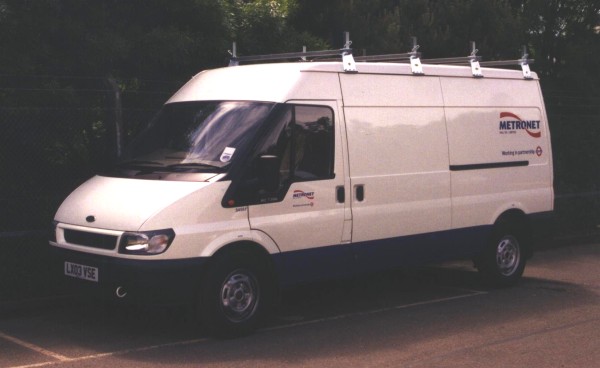 | Details: 5458F (LX03VSE) is a standard Ford Transit van new in 2003 and carrying Metronet livery. | |||