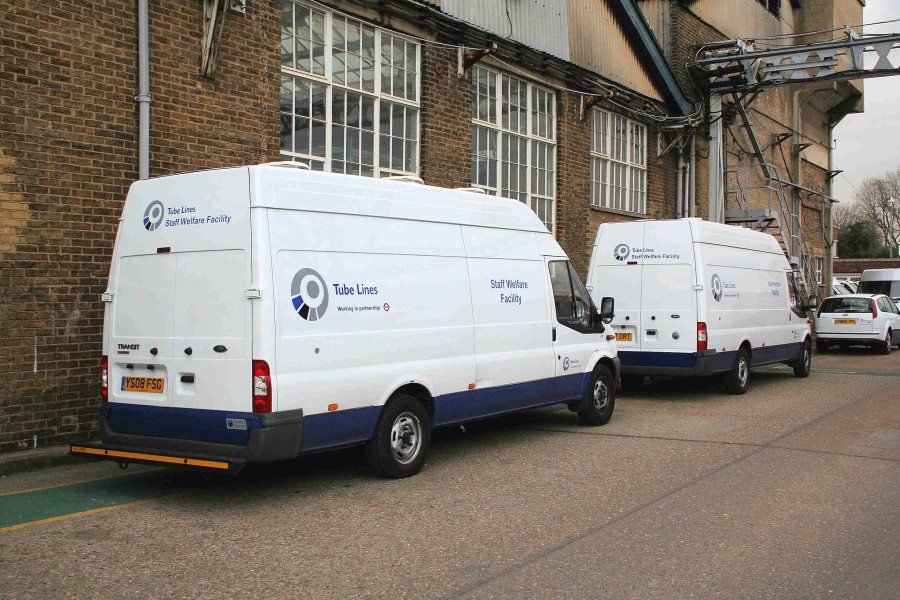 | Details: It is amazing what you pick out if you look at a picture long enough! What I have just noticed here is that the arrangement of the J, N and P coloured (ie silver, black and blue) segments of the Tube Lines logos is different on these two vans, the one on the front van being the more normal. Anyway, these are two more of the recent phenomenon of 'Staff Welfare Facilities' vans. An official fleetlist confirms our suspicions of what these are by recording 6517F as being fitted with 4 toilets! 6517F (nearest the camera) was converted by Clarks (hence the Yorkshire registration) but appears to have push-up roof vents as opposed to the 'spinners' seen on similar 6525F. 6464F has a more normal Kx registration. The pair were photographed at Acton Works on 31st March 2009. | |||||