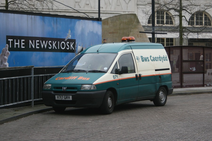 | Details: 'LTSV on-tour' ventures abroad again. Well, sort of! Parked in the bus station outside Cardiff Central station on 24th February 2009 is Cardiff Bus Peugeot Expert van 071. The van wears the cream and green livery that has ousted the traditional bright orange. As with the buses, the fleetname is in a different language on each side. | ||