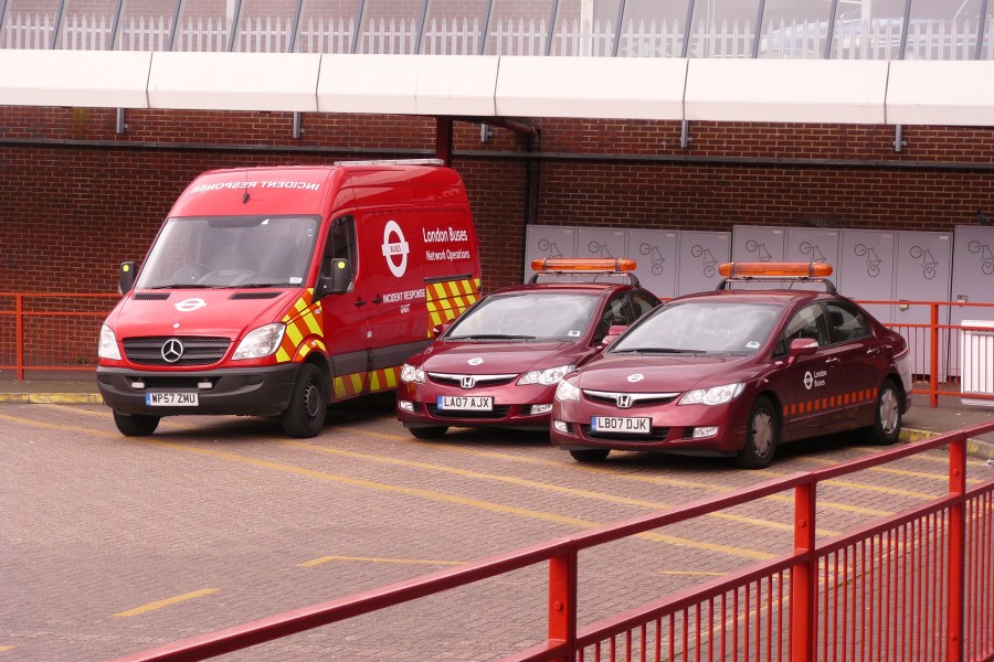| Details: With the possible exception of Ford Transit 5695F, the main LBSL fleet is now made up of just two types. There are 46 Mercedes-Benz Sprinter 'Incident Response Unit' vans and 16 Honda Civic hybrid-electric saloon cars. Both types were found at Eltham Bus Station on 5th March 2009. Van 6347M is a regular here (with frequent excursions to London Bridge), as is Honda 6309H in the middle. Honda 6298H moved here in 2009 after a period based at Sycamore House. | ||||||