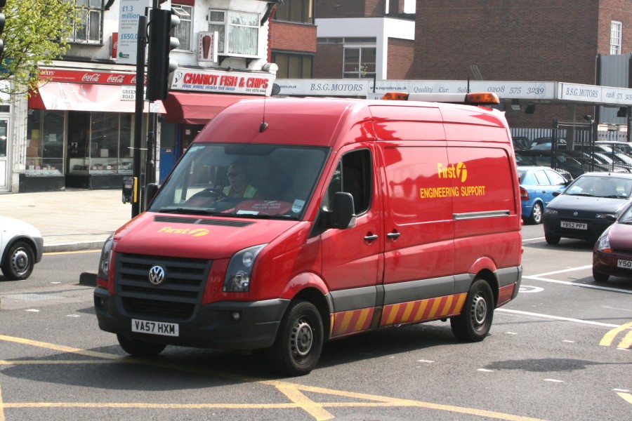 | Details: The Volkswagen Crafter design is easy to mistake for a Mercedes Sprinter, or even a Ford Transit from the front. It has not seen much use in the service vehicle fleets, First London VA57HXM being the only reported one among the bus companies. It carries their standard red livery with yellow lettering and skirt stripes. Its allocation is not confirmed but thought to be Greenford, supported by this photo of it passing the Red Lion pub on 15th April 2009. On the dashboard is what looks like a steering wheel cover with the First logo and the warning 'Do Not Move, Do Not Start'. | |||