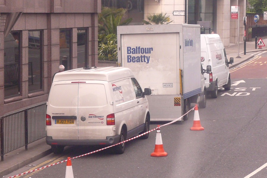 | Details: 6187VW was parked outside Mansion House Station on 9th May 2009 in company with some contractor's vehicles. It was however not ideally placed for photography. The picture seen was actually taken from the back window of a Routemaster on the 15. Note the 'tacked-on' appearance of the roof, and the spinning vent. | |||