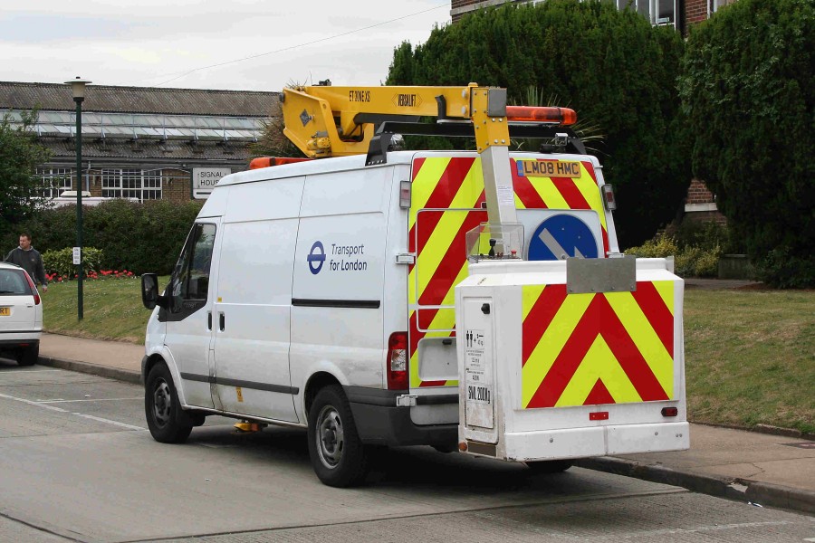 | Details: Another view of 6296F at Acton Works on 12th June 2009 shows the 2-man 'bucket' complete with controls, and the roof bar that supports the lifting arm. A second light-bar is mounted on this bar, offset to the right. Note the re-positioned number plate and the extra lights fitted near the top of the rear. Although the fleetnumber of 6296F is not carried, it is notable for being rather low for an '08 registered vehicle. Adjacently numbered vehicles entered service in late summer 2007, but 6296F was not licensed until the end of June 2008. Presumably there was a longer than normal lead-time for leasing such a specialised vehicle. | ||||