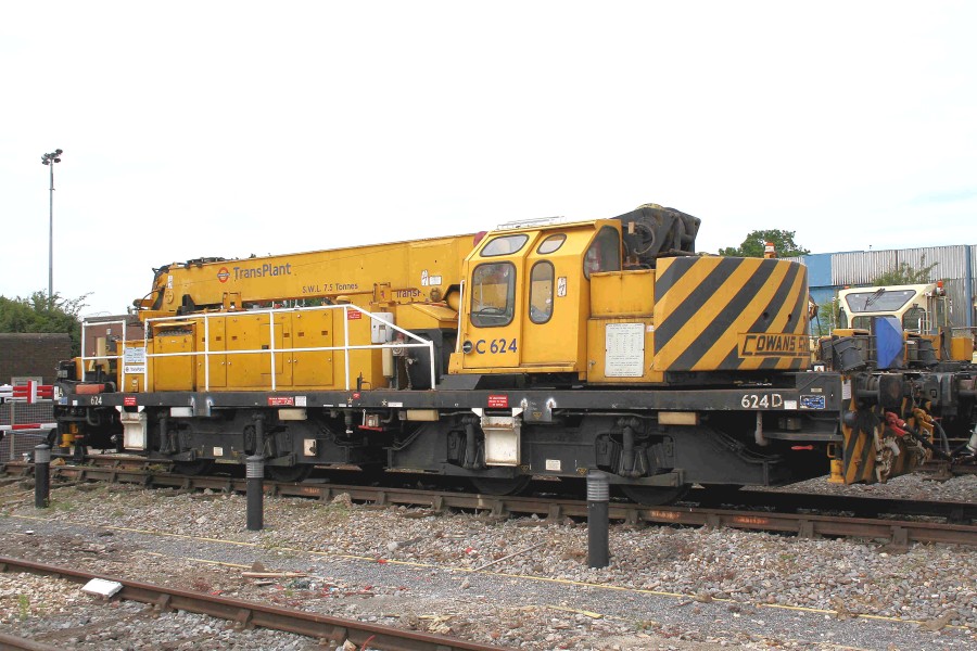 | Details: A close-up of Cowans Sheldon crane C624 at Ruislip Depot on 12th June 2009. Built in 1984 and capable of running through tube tunnels, these cranes have similar bogies to the longer TRM machines, but mounted much closer together. The single extending jib has a lifting capacity of 7.5 tonnes. | |||