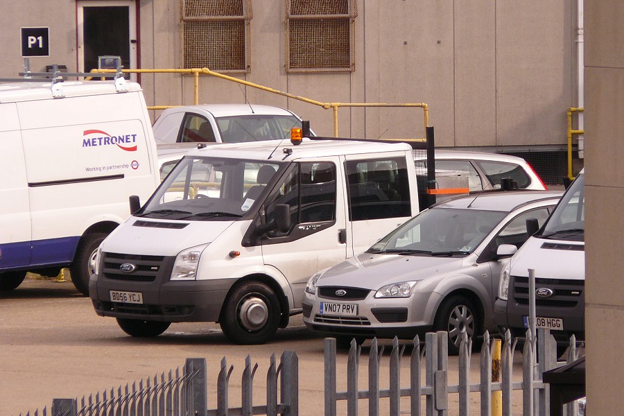 | Details: A long-zoom shot of Lillie Bridge depot taken on 9th May 2009 sees a number of Metronet vehicles parked in the gap between the buildings. The silver Ford Focus estate is 6201F (number not carried on nearside) with Ford Transit Minibus 6473F just visible on the right. The Transit dropside in the centre is BD56YCJ, a member of the unliveried fleet since January 2007, while Transit van 6331F is on the far left. Two more silver Ford Focus estates can be glimpsed further back, along with a single Ford Fiesta van. There are two Fiesta vans in the current leased fleet (6279F and 6399F) but it is not known if this is one of them. | ||||