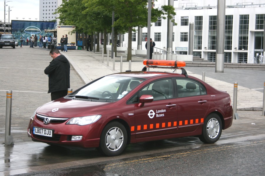 | Details: Honda Civic hybrid 6306H is from the rather hard to find west London allocation, latterly based (sometimes) at Wembley Olympic Way. This allocation is thought to have moved elsewhere but on 10th June 2009 the car returned to the area in connection with an England football game at the stadium. Tube services were seriously affected by a 2-day industrial action at the time, and numerous extra buses were provided as cover. Several LBSL vans were parked nearby. | |||
