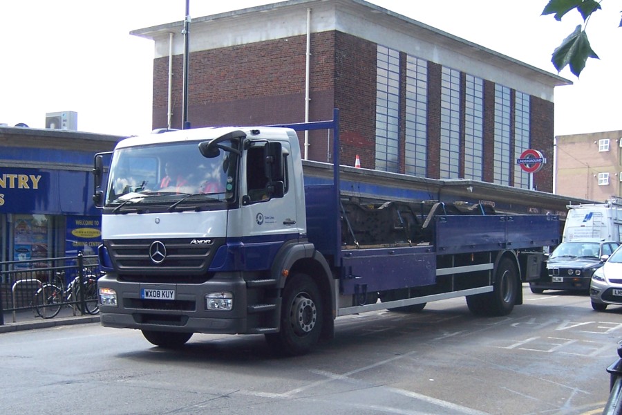 | Details: Ten new lorries joined the Tube Lines fleet in 2008 comprising 6 Merecedes and 4 Ivecos. The last of the 10 to be illustrated on this site is Mercedes-Benz Axor dropside lorry WX08KUY. Sister vehicles WX08KUT and WX08KUV were delivered in April while KUY did not turn up until June or July. An interesting aspect of these vehicles is that several were first registered some days after delivery to Acton, although the WX series are west country registrations associated with the Mercedes importer. On 23rd June 2009, KUY was caught passing Acton Town Station, loaded with a pair of tube bogie frames. Note that the front dropside panel is lowered although whether this was deliberate is not known. | |||