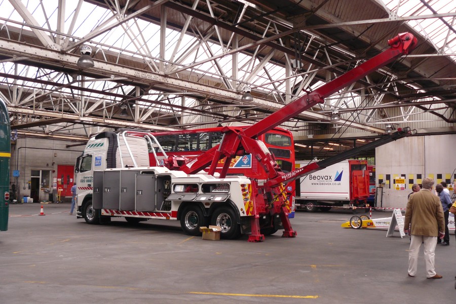 | Details: Another view of Sovereign Recovery GJ58NUF on display at the Potters Bar Garage open day on 4th July 2009, showing the impressive capabilities of the recovery equipment fitted. On the right is a dragster that was periodically started up for a minute or two. In the enclosed space the racket it made was unbelievable. | ||||