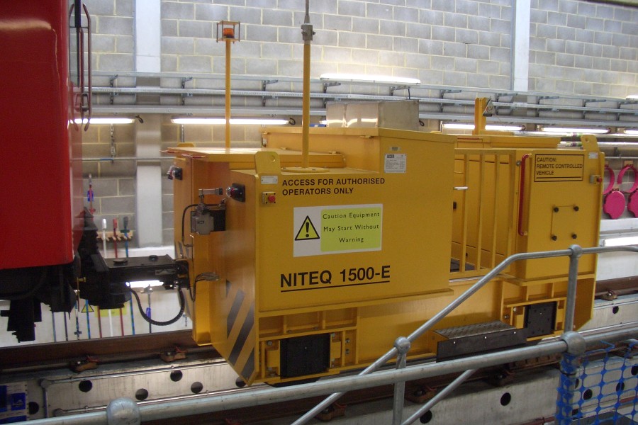 | Details: Another view of the Niteq 1500-E remote-control loco at Upminster depot on 29th August 2009 shows the adaptor fitted on the 'rear' to permit coupling to LUL rolling stock. | |||