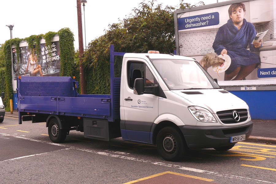 | Details: Mercedes-Benz Sprinter dropside truck 6695M was new in December 2008 and to date remains unique within the leased fleet. It is operated by the Tube Lines escalator management team based at Frank Pick House and carries appropriate cabside lettering. On 24th August 2009 I caught it heading for home along Bollo Lane at Acton (with a large dog leaning out of the nearside window???). | |||