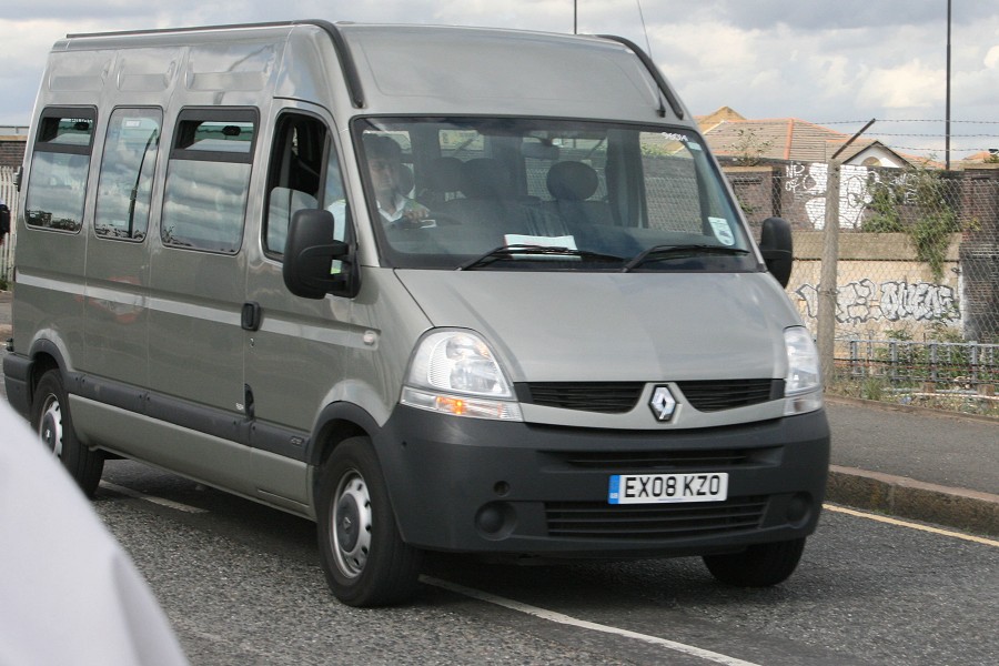 | Details: The crew ferry minibuses with East London are relatively easy to see, shuttling between the new garage at West Ham and the nearby station (although they also run to other locations). Having said that, they have not been particularly well covered on this site yet. Helping redress that are two shots from John Lloyd-Martin. The first shows Renault Master EX08KZO (fleetnumber 96014 visible in the windscreen and low on the side) coming down from the bridge on Stephenson Street on 25th August 2009. Three Masters were acquired, the remainder being the smaller Trafic model. It would appear that the other two of the trio have now transferred to Rainham garage. Note that no logos are carried. | |||