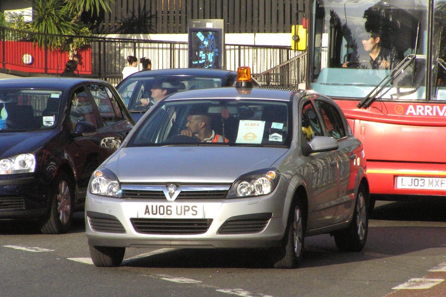 | Details: ... they helpfully carry notices in the windscreen! AU06UPS is another of the Vauxhall Astra hatchback cars used by Almex. It was photographed at the Elephant and Castle on 17th August 2009. | ||