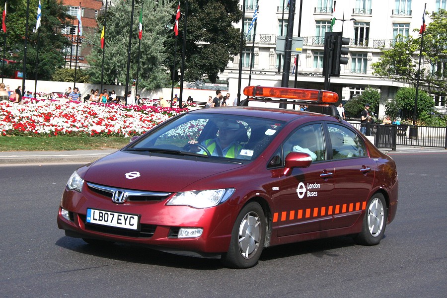 | Details: Honda Civic saloon car 6297H is one of the lesser spotted members of the 16-strong fleet employed by London Buses. The few sightings suggest it is based somewhere in west London, perhaps at the newly discovered Isleworth office. However, on a sunny 31st August 2009 it was caught heading around flowery Marble Arch. | |||